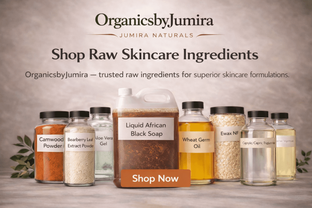 OrganicsbyJumira offers natural skincare products and pure cosmetic raw ingredients in Nigeria. Shop the SKC’Jumira skincare range including Squalane Glow Body Oil, Facial Oil, Night Oil, Hand and Cuticle Oil, and Black Soap Honey Wash — all formulated for Nigerian skin. Through Jumira Naturals we supply over 124 cosmetic raw ingredients including carrier oils, essential oils, active ingredients like niacinamide and alpha arbutin, botanical powders, plant butters, and clays for skincare formulation. We ship nationwide across Nigeria and accept international orders.