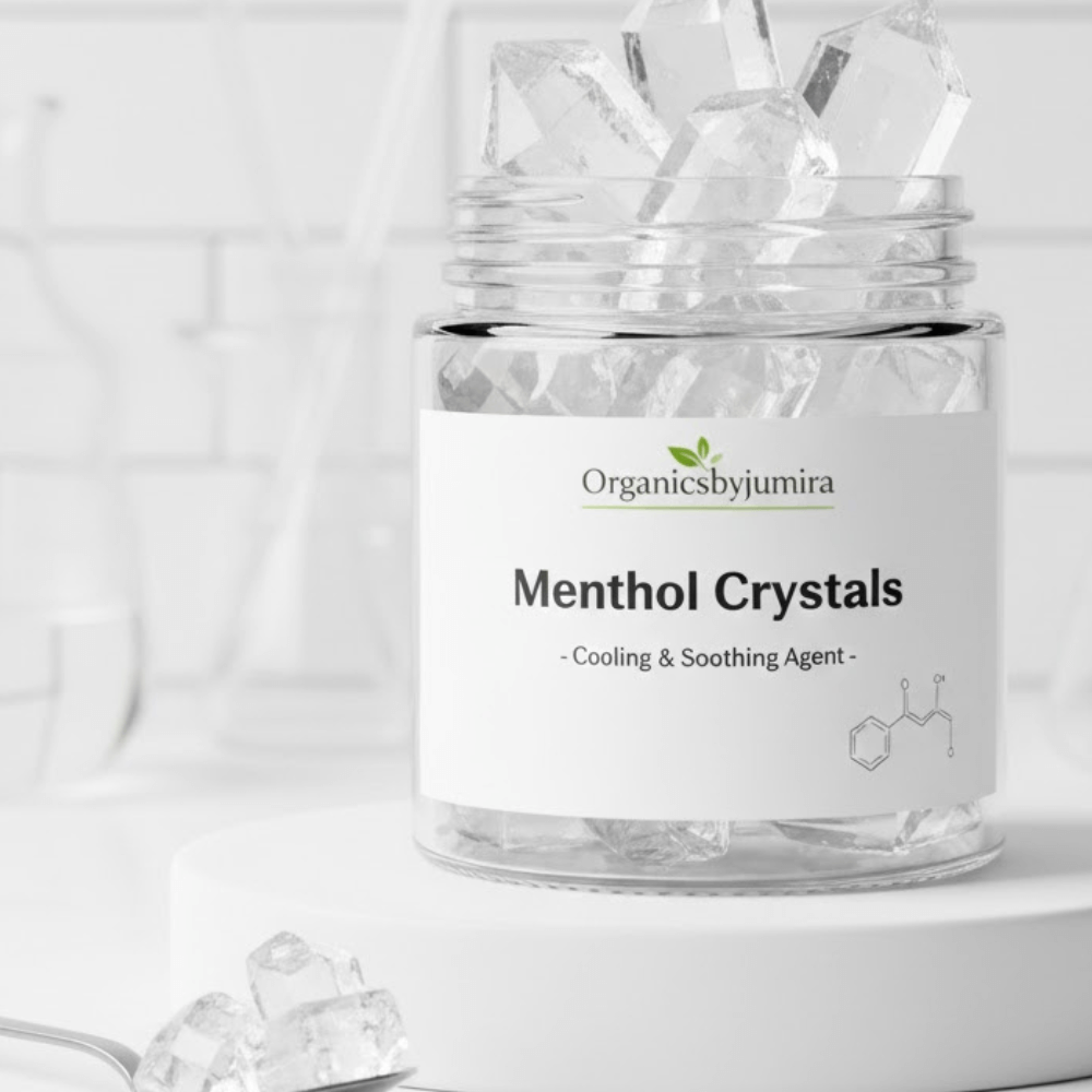 Keywords: menthol crystals, peppermint extract, skincare cooling, natural balm, minty essential, pain relief, comedogenic 1, soothing skincare, OrganicsbyJumira
